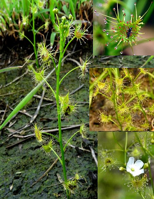 多年生柔弱小草本,高6~25厘米。根球形。茎直立,纤细,单一或上部分枝。根生叶较小,圆形,花时枯雕;茎生叶互生,有细柄,长约1厘米;叶片弯月形,横径约5毫米,基部呈凹状,边缘及叶面有多数细毛,分泌粘液,有时呈露珠状,能捕小虫。短总状花序,着生枝梢;花细小;萼片5,基部连合,卵形,有不整齐的缘齿,边缘有腺毛;花瓣5,白色,狭长倒卵形,较萼片长,具有色纵纹;雄蕊5,花丝细长;雌蕊单一,子房上位,1室,花柱3,指状4裂。蒴果室背开裂。种子细小,椭圆形,有纵条。花期5~6月。
