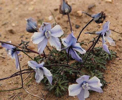 多年生草本,高3~7.5厘米,具短柔毛。茎基部有残叶柄。基生叶3深裂,裂片再浅裂或深裂,柄长1.5~6.5厘米。伞房花序,花2~5朵,花梗带棕红色,萼片5,淡蓝色至蓝色,椭圆形,长2~2.5厘米,后面一枚萼片延长成距,长2~2.5厘米,密被黄绿色柔毛。??果。种子多数,沿棱生狭翅。