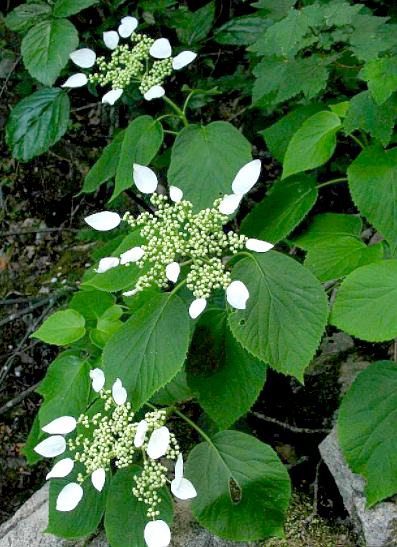 落叶灌木,高4米以上。叶对生,卵形或带倒卵圆形,长8~15厘米,先端渐尖,基部圆至浅心形,边缘具整齐锐齿牙,下面叶脉及叶柄密生粗毛。伞房式聚伞花序顶生,花轴密生粗毛;花2型,周边不育花,仅一片大形萼片,呈倒卵形或椭圆状卵形,先端钝,萼片柄长3~5毫米,密生粗毛;孕性花小,萼片5,花瓣5;雄蕊10;花柱1。蒴果倒圆锥形,具10条纵肋。种子线形。花期5~6月。