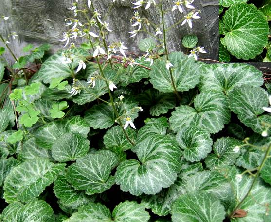 多年生常绿草本,高达40厘米,全体有毛。匍匐枝赤紫色,丝状,着地可生幼苗。叶数片,丛生在茎基部;圆形或肾形,肉质而厚,宽4~9厘米,先端浑圆,边缘浅裂状或波状齿,每浅裂疏生锯齿3~4个,基部心脏形或截形,上面绿色,下面带紫红色,有小圆点;叶柄长,基部膨大。花茎由叶腋抽出,比叶高2倍以上,赤色;总状花序长12~20厘米,苞片卵状椭圆形,先端尖锐,小花柄密被红紫色腺毛;萼5片,卵形,先端渐尖;花瓣5片,白色,不整齐,下面2片较大,上面3片较小;雄蕊10,不等长;蜂蕊1,子房球形,上位,花柱2歧,柱头细小。蒴果卵圆形,顶端2深裂,呈嘴状。种子卵形,具瘤状突起。花期6~7月。果期7~11月。