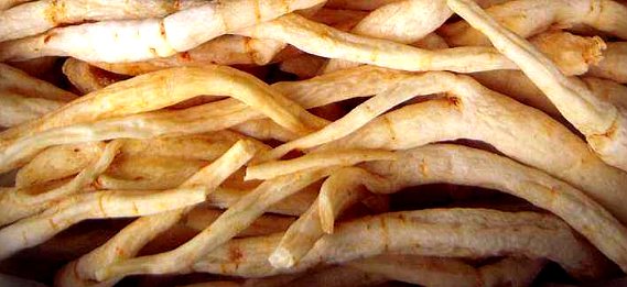 ②粉沙参:干燥的根,大小与明党参相似,唯外表面淡黄色,不现蜡光。质硬,断面类白色,粉状,棕色形成层极明显。气微香。以身干、色白者为佳。