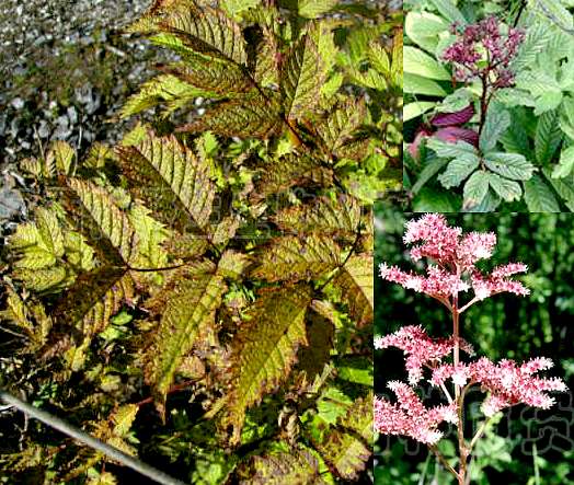 多年生草本,高30~88厘米。根茎粗壮,紫褐色。茎无毛,不分枝。叶基生并茎生,为羽状复叶,有时最上部茎生叶为单叶;小叶(3~)5~9,侧生小叶均对生,狭倒卵形或矩圆状倒披针形,长6.5~18厘米,宽2.4~6.5厘米,边缘有不整齐牙齿,上面几无毛,下面疏生短柔毛。圆锥状花序长达20厘米;花梗长2.5~4.5毫米,密生短柔毛;花直径6~9毫米;花萼裂片5,粉红色残白色,三角状卵形;无花瓣;雄蕊10,心皮2,下部合生,子房半下位。蒴果紫红色。种子细小多数。