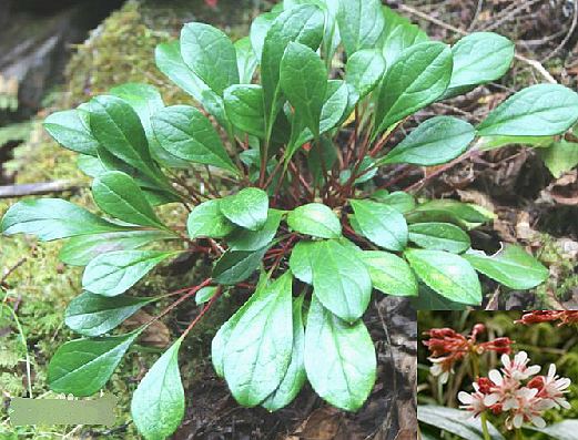 多年生草本,高约20厘米。根茎扭曲或具短的地上茎,顶端具狭卵状披针形的鳞片。叶基生,革质,倒卵状匙形,长6~10厘米,全缘,有网脉,上面绿色,下面白绿色,两面光滑;叶柄粗壮,带红色,基部半抱茎。花为总状花序式的头状花序,顶生;有线状披针形的小苞片;花梗细长,稀被短曲柔毛;萼有鳞片状的苞片,5深裂;花冠5裂,裂片倒卵形,全缘,覆瓦状排列;雄蕊5,另有5枚退化,匙形,被毛,雄蕊合生成一环,生于花冠的基部;子房上位,3室,花柱1,柱头盘状。蒴果。花期5~7月。果期7~9月。