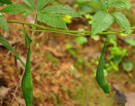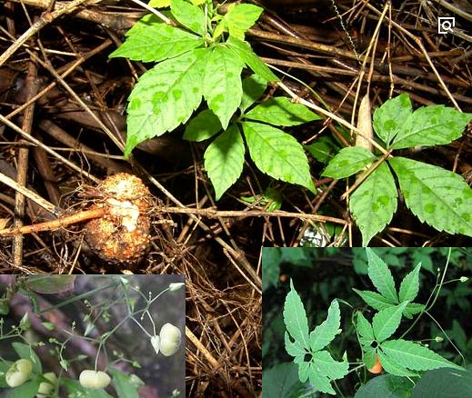 多年生攀援草本,长3~8米,全株无毛。块根扁圆形,膨大,重量可达效十公斤,外皮褐色,内白色粉质。茎纤细,有纵棱,卷须多不分枝。叶互生,复叶又指状;小叶5~9片,狭卵状披针形,长4~12厘米,宽1.5~3厘米,先端渐尖,基部楔形,边缘有粗锯齿;叶柄长2~5厘米。花单性,雌雄异株,3~5朵组成腋生聚伞花序;雄花小,径不及1厘米,萼5片,卵形,花冠黄色,深5裂,裂片反折,内部有白色绒毛,雄蕊5,分离,花丝短粗;雌花花瓣5裂,反折,红黄色,花柱3枚,柱头2裂。蒴果圆柱形,有棱。种子大而少,无翅。花期夏季。