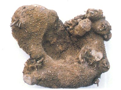 【性状】完整的块根,呈不规则的圆块形或椭圆形,略似乌龟状,大者直径可达20厘米左右。切开者多为对开、四开或呈不规则的块状。外皮棕黄色或灰棕色,微粗糙;断面淡白色。质坚实,多粉质。气微,味微苦。以块均匀,肉厚实,质细致,纤维少,外皮平坦,色黄鲜艳者为佳。肉身乌黑、干枯、内部空松多纤维者为次品。