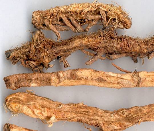 ②光知母:又名:知母肉。为去皮的干燥根茎。较毛知母瘦小,长约3~13厘米,直径约1厘米。表面黄白色或淡黄棕色,有扭曲的纵沟,一侧可见多数不规则散在的小形根痕。质硬,易折断,断面白色或黄白色,有的显筋脉点,水浸后有粘液。气味同毛知母。以肥大、滋润、质硬、色黄白、嚼之发粘者为佳。