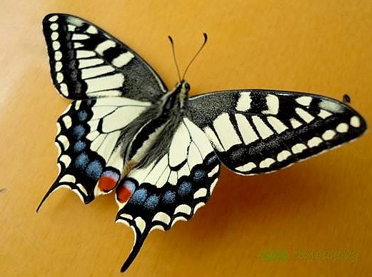 体长圆形,密被鳞片和丛毛;体长约4厘米,展翅宽约10厘米。头部有半球形复眼1对,复眼内侧,有细长球棒状触角2条。口器虹吸式。胸部3节,中、后脚发达;翅2对,色彩鲜艳,在黄色的底色中,散布有黑色的斑纹;后翅具有1尾状突。足3对,前足发达;前胫节具有前胫突1枚,爪大,内缘光滑,不分叉。腹部狭长,末端数节,形成生殖器。幼虫形似家蚕,体长约5厘米,体表光洁而无棘突。胸足3对,皆分节。前胸前方中央具有黄色叉形的臭角1枚,受惊时能伸出体外,放出臭气以御敌;后胸粗壮。腹部有假足5对。全体浅绿色,有黑色环状条纹并间有金黄色斑点。寄居于茴香枝叶间,以其叶及嫩枝为食。