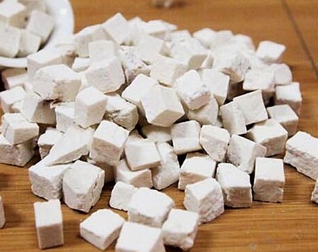 【性状】茯苓个呈球形,扁圆形或不规则的块状,大小不一,重量由数两至十斤以上。表面黑褐色或棕褐色,外皮薄而粗糙,有明显隆起的皱纹,常附有泥土。体重,质坚硬,不易破开;断面不平坦,呈颗粒状或粉状,外层淡棕色或淡红色,内层全部为白色,少数为淡棕色,细腻,并可见裂隙或棕色松根与白色绒状块片嵌镶在中间。气味无,嚼之粘牙。以体重坚实、外皮呈褐色而略带光泽、皱纹深、断面白色细腻、粘牙力强者为佳。白茯苓均已切成薄片或方块,色白细腻而有粉滑感。质松脆,易折断破碎,有时边缘呈黄棕色。