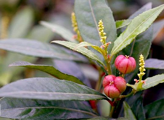 常绿小乔木,高30~60厘米。树皮平滑,有多数皮孔,皮层内含乳液,切伤后即流出。单叶互生,半革质;叶片倒卵形或椭圆状披针形,长6~9厘米,先端渐尖,边缘有细微锐齿,基部楔形,上面绿色,下面淡绿色,中脉及侧脉均为紫红色;叶柄长4~6毫米,紫红色。花黄绿色,单性,雌雄同株;花序为直立的穗状花序,雄花在上,雌花在下:雄花20朵龙右,基部有腺体2个,苞片1,花萼3,雄蕊3,花丝直立,花药黄色;每一苞片内有雌花1~3朵;雌花基部两侧各有腺体1个,花萼3,雌蕊1,子房圆球形,3室,花柱3裂,紫红色。分果圆球形而稍扁,直径约1厘米,成熟后紫红色,分裂为3个小干果,每一小果有种子1粒。花期5月。果期7月。