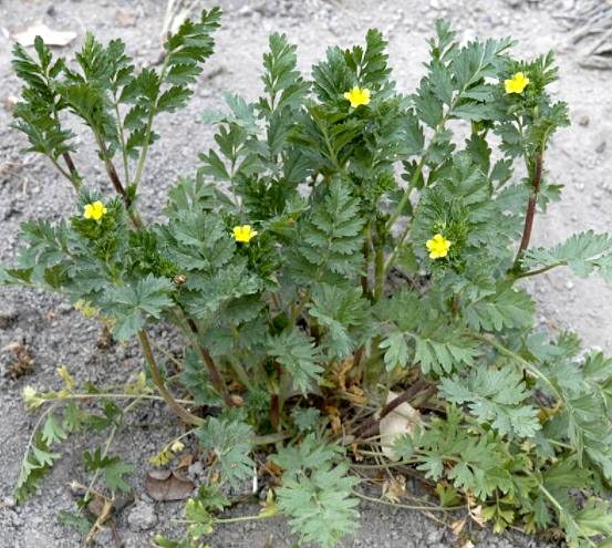 多年生草本,高30~60厘米。根肥大,圆锥状。茎直立,密生灰白色绵毛。单数羽状复叶,基生叶有小叶8~11对,顶端小叶最大,两侧小叶向下渐次变小,小叶狭长椭圆形,长2~5厘米,宽8~15毫米,边缘羽状深裂。裂片三角状披针形,边缘向下反卷,上面被短柔毛,下面密生白绵毛;托叶长披针形至椭圆状披针形,全缘残羽状裂,密被长绵毛;茎生叶与根生叶同形而较小,小叶1~7对。花多数,顶生,呈伞房状豪伞花序;花萼5裂,裂片广卵形,副萼5片,披针形至线形,均有白绵毛;花瓣5,黄色,倒卵状圆形,凹头;雄蕊多敷,花丝不等长,花药黄色;雌蕊多数,聚生,子房卵形而小。微扁,花柱侧生,柱头小。瘦果卵圆形,长约2毫米,褐色,光滑,包于宿存花萼内。花期6~8月。果期8~10月。