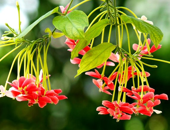 藤状灌木,嫩枝幼叶具黄色柔毛。叶对生,长圆形或长圆妆披针形,长4.5~15厘米,宽2~6厘米,先端渐尖,基部圆形或略呈心脏形,全缘,老叶下面,尤以叶脉及边缘处存留柔毛;叶柄长5~15毫米,下部有关节。叶落后关节以下部分成为棘状物;穗状花序生于枝条的顶端,下垂,略有芳香;每花下具有苞片1枚,披针形或线形,脱落性;萼筒细管状,伸出于子房上,长约6厘米,先端5裂齿,短三角形,有柔毛及腺毛;花瓣5,长圆形或倒卵形,长约1厘米,先端圆,基部宽楔形,与萼齿互生,蕾呈紫红色,而被覆盖的1/2部分呈白色,开放后渐转紫红色;雄蕊10,排成上下两轮,花丝着于萼筒,上轮5枚外露;雌蕊1,子房下位,圆柱状纺锤形,有5纵枝,具柔毛及腺毛,花柱细长,外露,下部与萼筒合生,柱头短。果实橄榄状,长2.5~4厘米,黑褐色或棕色,有5棱。花期5~9月。果期6~10月。