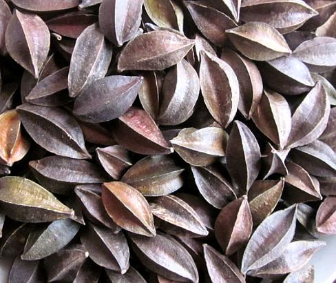 【性状】干燥果实长卵形或椭圆形,具5条纵棱,两端尖,形如棱状,长2.5~4厘米,直径1.5~2厘米。外壳黑褐色或紫黑色,平滑,微有光泽;质坚硬,体轻,不易折断。切断面五角星形,棱角部皮较厚。内藏种子一粒。种仁狭纺锤形,长1.8~2.6厘米,直径0.6~1厘米。种皮灰白色,有黑灰斑块,质薄,易剥离而露出黄色的子叶,表面有多数纵皱纹。子叶2片,肥厚,边缘不整齐,胚根不明显。气微香;炒熟后较显著,味淡。以个大、颗粒饱满、种仁色黄、味香甜而带油性者为佳。