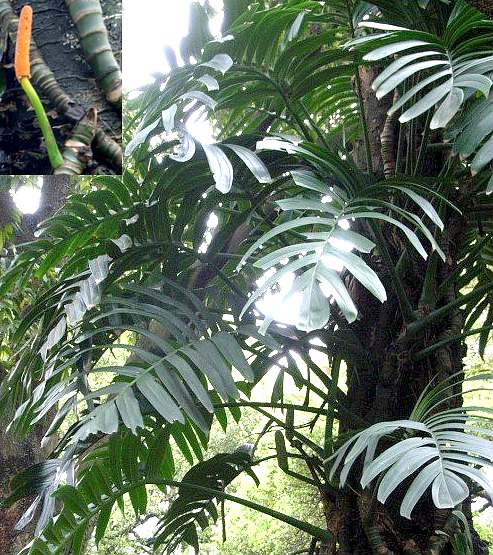常绿本质攀援藤本,长达8米。茎绿色,粗大,节处生根。叶大,长圆形,长40~50厘米,宽30~35厘米,羽状深裂通常几达中脉。肉穗花序无柄,圆柱形,长约20厘米,外托一白色大型佛焰苞片,苞片常脱落。