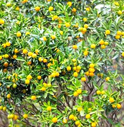 常绿灌木或小乔木,高达3米。枝密生,通常无刺。叶互生;叶片长椭圆形、披针形或矩圆形,长4~8厘米,宽2~3厘米,先端钝或钝尖,叶缘微波状或具不明显的细锯齿,基部楔形,下面密生腺点;叶柄长0.5~1厘米,有狭翅。花单生或2~3朵簇生于新枝的叶腋,花梗长3~5厘米,花径约1.5厘米;萼片5,绿色;花瓣5,白色,狭长矩形,向下反卷,长约7毫米;雄蕊20~25,基部不规则的合生成几束;雌蕊1。柑果长倒卵形或长椭圆形,长2~3.5厘米,顶端浑圆,有宿存的花柱;果皮平滑,有光泽,成熟时金黄色,果皮厚,油腺密生;瓤囊4~5瓣,汁多味酸。花期6月。果熟期12月。