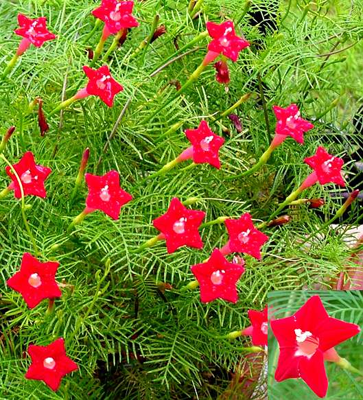 一年生柔弱缠绕草本,秃净无毛,长可达4米。叶的轮廓卵形,长4~7厘米,羽状深裂为多数线形疏离的裂片;托叶两枚,与叶同形。聚伞花序腋生,有花数朵,通常长于叶;花直立;萼片5,绿色,椭圆形,长约5毫米,先端钝而有小凸尖;花冠深红色(也有白色变种),高脚碟状,长2.5厘米或过之,管柔弱,上部稍膨大,短5裂;雄蕊5;子房4室,柱头头状。蒴果,卵形,长7~8毫米。花期春至秋季。