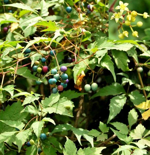 藤本。茎粗0.7~1厘米,光滑,具细条坟与圆形皮孔,嫩枝被柔毛。卷须与叶对生。叶互生,多数3全裂。中间小叶长椭圆形至宽卵形,先端渐尖,基部楔形或圆形,有短柄或无柄,侧生小叶极偏斜,斜卵形;少数成单叶3裂,宽卵形,长宽5~12厘米,先端渐尖,基部心形,上面深绿色光滑,下面灰绿色,脉上被锈毛。聚伞花序与叶对生;花小,绿色;花瓣5;雄蕊5,花丝很短;花盘杯状,与子房离生,花柱细长。浆果暗蓝色,圆形至扁圆形;种子2枚。花期5月。果期8~9月。