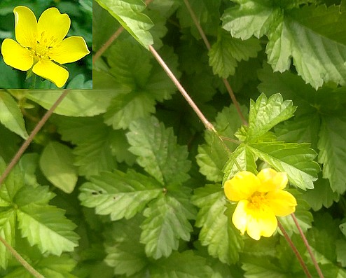 【原形态】绢毛匍匐委陵菜 多年生匍匐草本,匍匐茎长20-100cm。根多分枝,常具纺锤状块根。节上生不定根,被稀疏柔毛或脱落近无毛。基生叶为三出掌状复叶;叶柄伏生绢状柔毛,稀脱落被稀疏柔毛小叶有短柄或近无柄;托叶膜质,褐色,外面近无毛;小叶片倒卵形,先端圆钝,基部楔形,边缘两个小叶浅裂至深裂,有时混生有不裂者,上面几无毛,下面伏生绢状柔毛,稀脱落被稀疏柔毛;纤匐枝上叶与基生叶相似,托叶草质,卵状长圆形或卵状披针形,全缘,稀有1-2齿,先端渐尖或急尖。花两性;单花生于叶腋或与叶对生,花梗被疏柔毛;花直径1.5-2.2cm;萼片5,卵状披针形,先端急尖,副萼片5,长椭圆形或椭圆披针形,先端急尖或圆钝,与萼片近等长,外被疏柔毛,果时显着增大;花瓣5,宽倒卵形,先端显着下凹,比萼片稍长,黄色;花柱近顶生,柱头扩大。瘦果卵球形,黄褐色,外被显着点纹。花、果期4-9月。