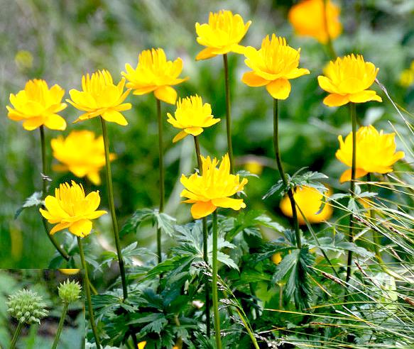 1.金莲花,多年生草本,高30-70cm。全株无毛。茎直立,不分枝,疏生2-4叶。基生叶1-4,长16-36cm,有长柄,柄长12-30cm,基部具狭鞘;叶片五角形,长3.8-6.8cm,宽6.8-12.5cm,3全裂,中央全裂片菱形,先端急尖,3裂达中部或稍超过中部,边缘具不等大的三角形税锯齿;例全裂片斜扇形,2深裂近基部,上方深裂片与中央全裂片相似,下方深裂片较小,斜菱形;茎生叶互生,叶形与基生叶相似,生于茎下部的叶具长柄,上部叶较小,具短柄或无柄。花两性,单朵顶生或2-3朵排列成稀疏的聚伞花序,直径3.8-5.5cm;花梗长5-9cm;苞片3裂;萼片通常10-15,金黄色,干时不变绿色,椭圆状卵形或倒卵形,长1.5-2.8cm,宽7-16mm,先端疏生三角形牙齿,间或为3个小裂片,或为不明显的小牙齿;花瓣(蜜叶)18-21,狭线形,稍长于萼片或萼乌片等长,长1.8-2.2cm,宽1.2-1.5mm,无端渐狭,近基部有蜜槽;雄蕊多数,长5-11mm,螺旋状排列,花丝线形,花药在侧面开裂,长3-4mm;心皮20-30。??果,长1-1.2cm,宽约3mm,具脉网,喙长约1mm。花期6-7月,果期8-9月。