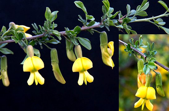 小灌木,高达1~2米。茎直立或多数丛生,小枝细长有棱,无毛,黄褐色或灰色。托叶2枚,狭锥形,常硬化而成针刺,长可达8毫米;双数羽状复叶,小叶4,倒卵形,长1~3.5厘米,阔0.5~1.5厘米,先端圆或凹,具小短尖或无小尖,上部一对小叶常较下方一对为大,革质或硬纸质,两面具细脉,无毛,上面深绿色而有光泽,下面较淡。花单生,黄色而带红,雕谢时褐红色;花枝中部有关节,上具极细小苞片;花萼钟状,萼齿阔三角形;花冠蝶形,旗瓣狭倒卵形,基部带红色,翼瓣先端田,下具长瓜,龙骨瓣阔而钝;雄蕊10,2体;雌蕊1,子房近于无柄,花柱直立,柱头小。荚果长约3.5厘米,两侧稍压扁,无毛,内含种子数粒,花期4~6月。