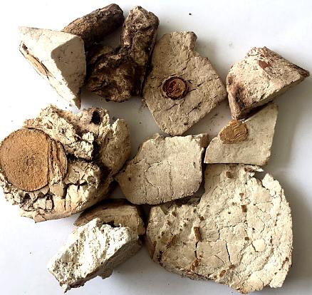 【原形态】菌核球形、卵形、椭圆形至不规则形,长10-30cm或者更长,重量也不等,一般重500-5000g。外面吸厚而多皱褶的皮壳,深褐色,新鲜时软干 后变硬;内部白色或淡粉红色,粉粒状。子实体生于菌核表面,全平伏,厚3-8cm,白色,肉质,老后或干后变为浅褐色。菌管密长2-3mm管壁薄,管口圆形、多角形或不规则形,径0.5-1.5cm,口缘裂为齿状。孢子长方形至近圆柱形,平滑,有一歪尖,大小(7.5-9)μm×(3-3.5)μm。