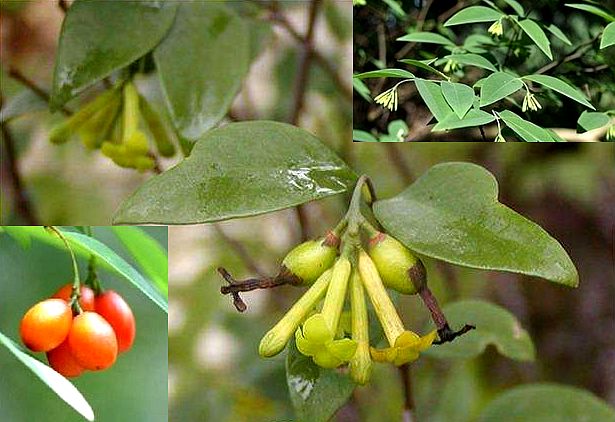 小灌木,高1~2米。树皮粗糙,小枝细瘦,披散,红褐色,无毛。叶对生,膜质至纸质,卵形或卵状椭圆形至卵状披针形,长2.5~8.5厘米,宽1.5~2.5(~4)厘米,先端长渐尖,基部楔形或近圆形,上面深绿色,无毛,下面淡绿色,被白粉,叶脉在下面隆起,明显;叶柄长0.1~0.2厘米。花黄绿色,4~8朵组成顶生近头状的总状花序,总花梗极纤细,下垂,无毛,长5~15毫米;花被筒状,长12~13毫米;无毛,裂片4,钝头;雄蕊8,2轮;花盘深裂成4枚方形鳞片;子房倒卵形,无毛。果椭圆形,熟时深红色。