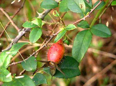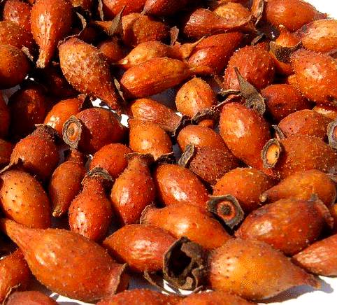 【性状】干燥果实呈倒卵形,略似花瓶,长约3厘米,直径1~2厘米。外皮红黄色或红棕色,上端宿存花萼如盘状,下端渐尖。全体有突起的棕色小点,系毛刺脱落后的残痕,触之刺手。质坚硬,切开观察,肉厚约1.5毫米,内壁附有淡黄色绒毛,有光泽,内有多数淡黄色坚硬的核。无臭,味甘微酸涩。以个大、色红黄、去净毛刺者为佳。