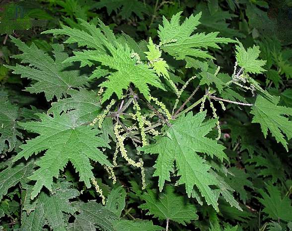 多年生草本。茎高达150厘米,有棱,生螫毛和紧贴的微柔毛。叶对生,叶片轮廓五角形,长4~12厘米,宽3.5~12厘米,3深裂或3全裂,1回裂片再羽状深裂,两面疏生短柔毛,下面疏生螫毛;托叶离生,狭三角形。雌雄同株或异株,同株者雄花序生于下方。花序长达12厘米,雄花序多分枝;雄花直径约2毫米,花被片4,雄蕊4;雌花花被片4深裂,花后增大,包着果实,长达2.5毫米,有短柔毛和少数螫毛,柱头画笔头状。瘦果卵形,扁,长约2毫米,灰褐色,光滑。花期7~8月。果期麻叶荨麻8~9月。生于山野、路边、草原、坡地。分布东北、华北、西北等地。