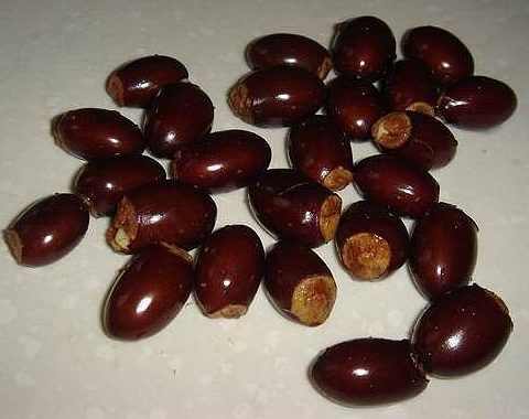 【性状】干燥种子呈长椭圆形,略扁,长2~2.5厘米;直径1~1.7厘米。表面棕红色或紫棕色,有光泽,一端有黄白色的种脐。质坚硬;剖开后有2片肥厚的子叶,灰黄色,质亦坚实。气微,味淡而涩。以干燥,粒大,饱满者为佳。