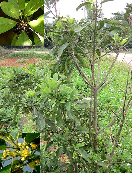 常绿小乔木或乔木,高3~15米,内皮有粘质,嫩枝、叶柄、叶下面、花序多少有柔毛。叶革质或纸质;叶形多种,倒卵形、倒卵状长椭圆形或椭圆状披针形,长6.5~20厘米,宽约5厘米,先端钝或圆,基部楔形、钝或近圆形,上面无毛,或近中脉略有短柔毛,下面绿色,被柔毛或近无毛,侧脉每边8~12条;叶柄长1~2.6厘米。花单性,雌雄异株;伞形花序生于近顶的叶腋内,单生或数个生于总花梗上;总花序梗长达2~4厘米,伞梗长约1厘米;总苞片4,每1苞内有花多数;花被不全或缺;雄蕊9或更多,花梗密被黄色绒毛。果球形,直径约7毫米。花期5~6月。果期6~7月。