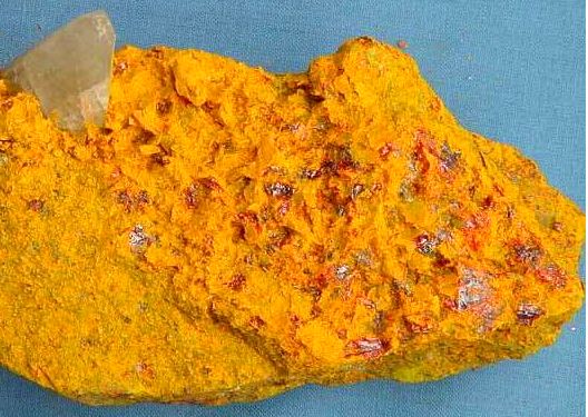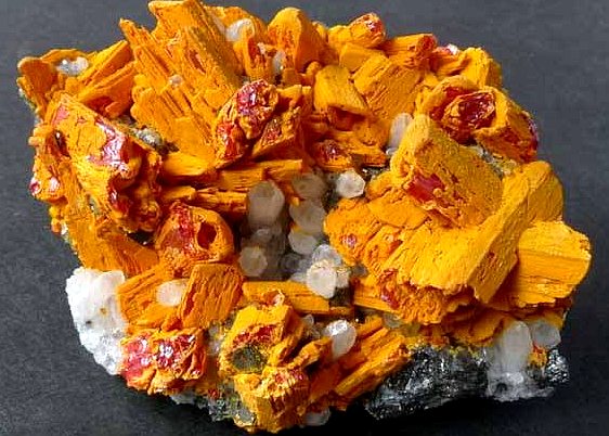 单斜晶系。晶体柱状,晶面上有纵行条纹,大多成致密块状或粒状集合体。颜色为橘红色,少数为暗红色。条痕淡橘红色。晶面具金刚光泽,断面呈树脂光泽。半透明。解理较完全。断口贝壳状。硬度1.5~2.0。比重3.4~3.6。性脆。受光的作用,久则变为谈橘红色粉末。产于低温热液矿脉内,温泉及火山附近也有存在。常与雄黄、辉锑矿等共生。