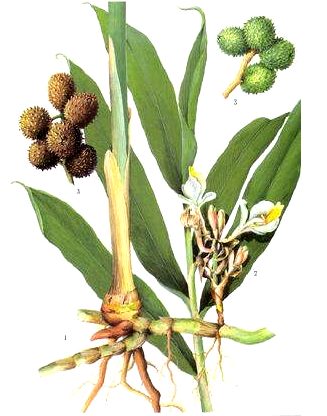 多年生草本,高达3米。根茎横走,有时肥厚。茎直立。叶线状披针形,长15.3~35厘米,宽4~7厘米,先端急尖或渐尖,呈尾状,基部渐狭,全缘,两面无毛:叶鞘革质,光滑;叶舌长4毫米,革质。花茎被绢毛,具鳞片叶,鳞片倒卵状长圆形,先端急尖;穗状花序,呈球形,苞片小,长圆形,长1.8~2厘米,光滑;花萼管状,3浅裂;花冠管状,长约2厘米,花冠裂片长圆形,长约1厘米;唇瓣匙形,长超过于花冠裂片,宽约1.8厘米,先端2裂,基部具宽爪;花药光滑,长约5.5毫米,药隔顶端的附属物呈半月形,两侧为耳状。蒴果坚硬,长椭圆形或球状三角形,直径约2厘米,具刺,棕色。