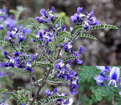 矮而多枝的灌木,密被白色短柔毛,小枝顶端成刺状。单数羽状复叶,小叶11~17,椭圆形至卵状椭圆形,先端具长刺尖,两面被白色长柔毛;托叶宿存,呈针刺状。总状花序腋生或顶生,多而散生;花梗较萼为短;萼钟状,密被白色长柔毛,萼齿三角形;花冠蓝紫色,旗瓣下部白色。荚果串珠状,长7~11厘米,密被短柔毛;有5~6颗种子。花期5月。