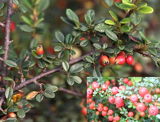 常绿矮灌木,高约1米。茎直立,分枝多,小枝红褐色至黑褐色,幼时有黄色柔毛,老时脱落。叶互生,倒卵形至倒卵状矩圆形,长4~10毫米,宽3.5~7毫米,先端钝圆,少数有凹缺或急尖,基部阔楔形,全缘,上面无毛或具稀疏柔毛,下面被带灰白色的短柔毛;叶柄长1~2毫米,有短柔毛。花常单生,少数有2~3朵,花梗甚短;花白色,直径约1厘米;花萼筒钟状,外面有细毛,萼片三角形;花瓣平展,5枚,近圆形。梨果球形,直径5~6毫米,红色,常有2小核。