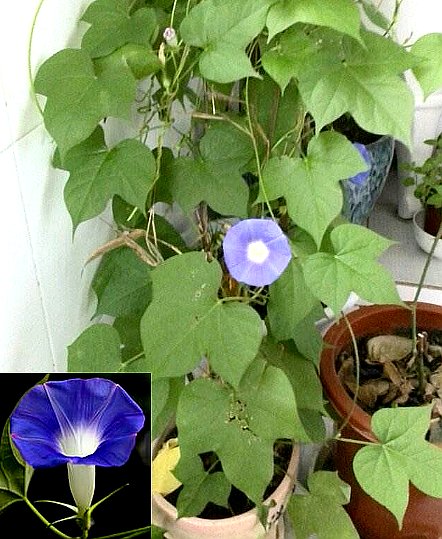 一年生攀援摹本,全体具白色长毛。叶阔心脏形,长7~12厘米,宽7~13厘米,先端短尖,基部心形,全缘。花1~5朵成簇腋生,花梗多巧叶柄等长;花萼裂片卵状披针形,长约1.5厘米,基部皆被伏刺毛;花冠漏斗状,通常为蓝紫色、粉红或白色。蒴果球形,种子黑色或黄白色,无毛。花期7~8月。果期9~10月。