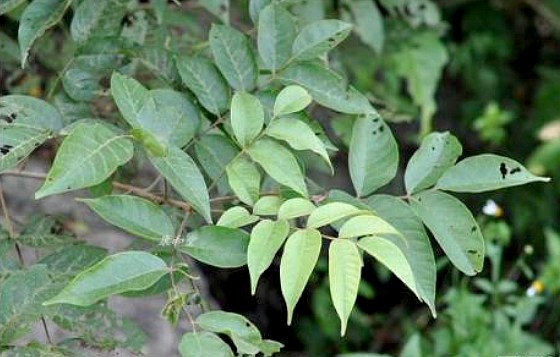 【原形态】厚皮树 落叶乔木,高5-10m。树皮灰白色,厚,小枝密被锈色星状毛。奇数羽状复叶,互生,常集生小枝顶端,长10-33cm,有小叶7-9,对生;小叶柄长1-3mm,被锈色星状毛;小叶卵形或长圆状卵形,长5.5-9cm,宽2.4-4cm,先端长渐尖,基部稍偏斜,全缘,上面无毛,下面沿脉上被星状毛和极稀疏微柔毛;侧脉6-10对;小叶膜质或薄纸质。总状花序顶生,分枝或不分枝;花小,黄色或带紫色,单性同株式异株;雄花序长15-30cm,分枝,雌花序较短,簇生小枝顶端,被锈色星状毛;花萼无毛,裂片卵形或阔卵形,长约1mm;花瓣卵状长圆形,长约2.7mm,宽约1.5mm,无毛,先端和边缘外卷;雄蕊与花瓣等长或略超过,在雌花中极短,不育;花盘无毛;子房无毛,卵形,4室,通常仅1室发育,花柱3-4,柱头盾状。核果卵形,略压扁,成熟时紫红色,长8-10mm,宽约0.5mm,无毛。花期3-4月。