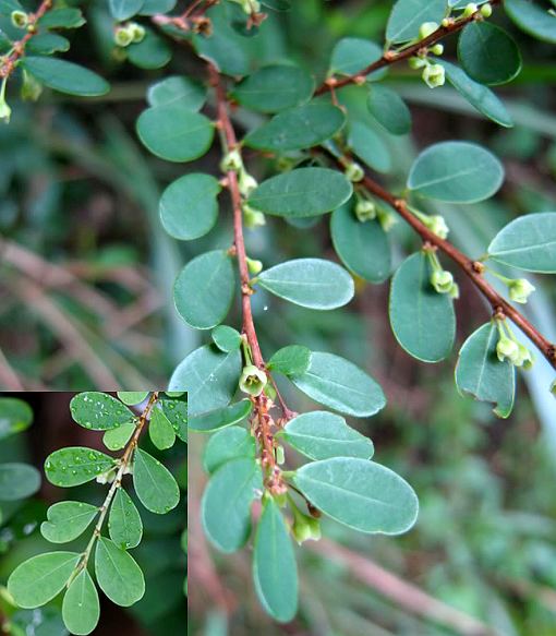 小灌木,多分枝,秃净。叶小,近革质,倒卵形或矩圆形,长6~10毫米,先端浑圆,基部钝或楔尖,全缘;托叶极小,具睫毛。花单性,雌雄异株,1~3朵聚生于叶腋内;雌花具柄,柄长4~6毫米,雄花柄较短;萼片6,阔卵形,极钝,长约2毫米,雄花的较短;花药3,长椭圆形,花丝合生成一粗厚的中柱。蒴果扁球形,直径约5毫米。种子长约2毫米,外种皮橙红色。花期4月。