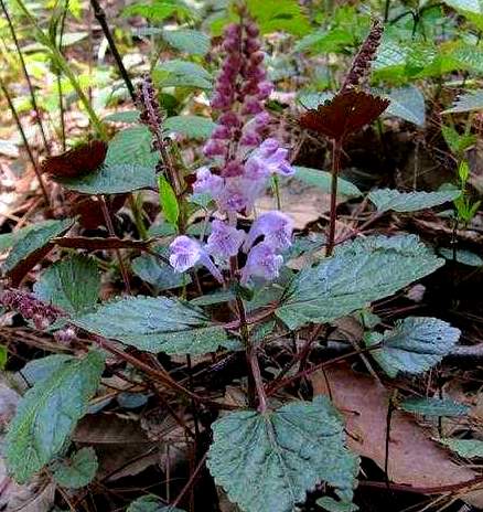 多年生上升或直立草本。茎高5.5-38cm,密被微柔毛,常带红色。茎叶常2-4对,密集于茎基如基生叶状,具短柄;叶片椭圆形,卵圆形或宽椭圆形,长1.5-7.4cm,宽1-4.8cm,两面被短柔毛,下面常带紫色。花互生或少数花序下部者对生,组成背腹向,长5-24cm的总状花序;花萼长约2mm,盾片开张,半圆形,果时增大,高起且外反,几与萼等长;花冠紫色,长9-12mm,冠筒由下至上渐大,冠檐二唇形,上唇盔状,先端微凹;雄期6-11月,果实渐次成熟。