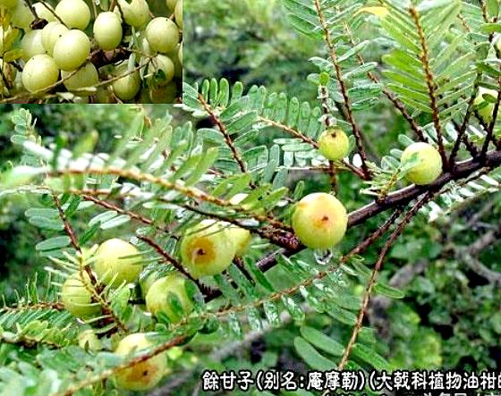 【别名】余甘子(《临海异物志》),余甘(《唐本草》),庵摩落迦果(《纲目》),望果(《中国树木分类学》),油甘子(《广州植物志》),牛甘子(《南宁市药物春》),橄揽子(《四川中药志》),喉甘子、鱼木果(《广西药植名录》),滇橄榄(《云南中草药选》)。