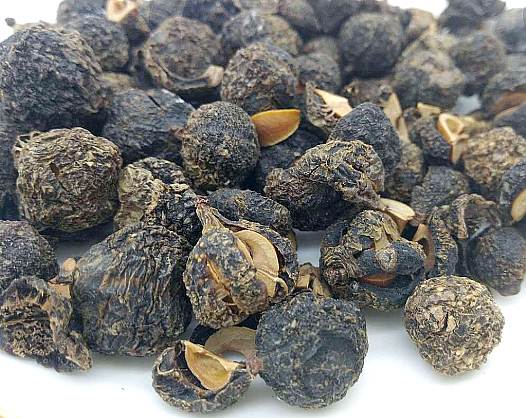 【药材】干燥果实呈圆形或不规则的圆形,微显六瓣状,径约2厘米;表面棕褐色,粗糙不平,有细小的疣状突起,基部遗有圆点状的果柄痕迹。质坚实,不易破碎,破碎后内显黄白色;种子不大。气微,味甜带涩。以干燥、饱满,无果柄及叶片掺杂者为佳。