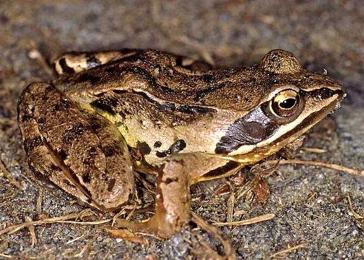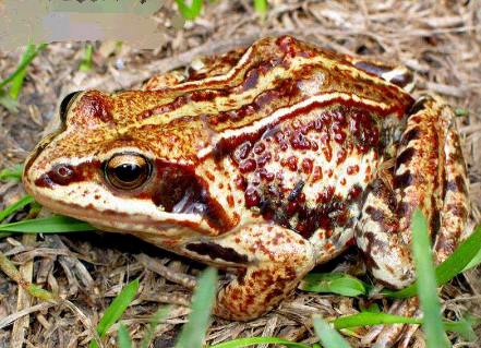 ②黑龙江林蛙:形状与上种相似。皮肤粗糙,咽、喉及腹部有鲜艳的朱红色与深灰色花斑。雄蛙无声囊。