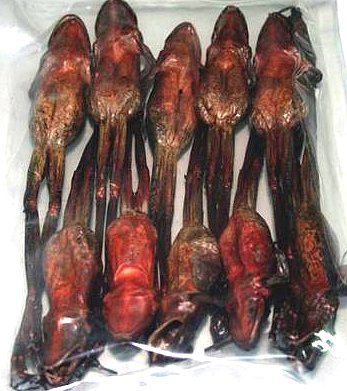 【性状】干燥的哈士蟆,全身僵直,有紫褐色斑点,腹部黄白色,微带红色,腹中空虚,后肢腹面常呈淡红色。肉质干枯,体轻松,气腥。以体大,腹面色泽黄红,身干者为佳。