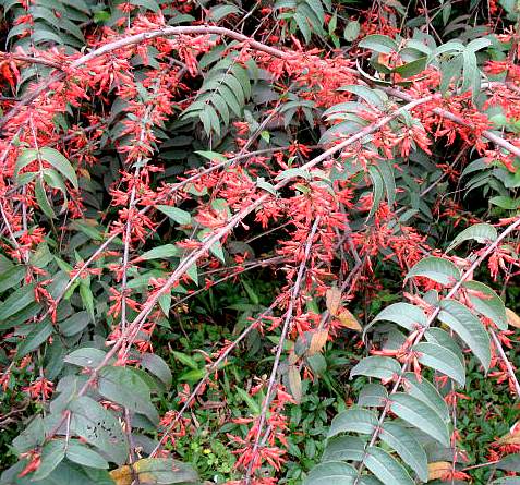 灌木,高1.5~3米。幼枝被短柔毛,后脱落。叶对生,革质,拔针形或狭披针形,长7~12厘米,宽2~3厘米,上面通常近无毛,下面微白色具微小黑腺点,被短柔毛,近无柄。聚伞花序腋生,圆锥状,长约3厘米,花序轴被毛;小苞片早落;花两性,具长约3毫米的花梗;花萼简状,鲜红色,长1~1.3厘米,口部略偏斜,具6齿,萼齿之间有小附属体;花瓣6,通常不长于萼齿;雄蕊12,生于萼管下部,明显伸出;子房上位,2室,花柱比雄蕊稍长。蒴果狭椭圆形,长约7毫米,包藏于萼管之内,2瓣裂,具多数种子。花期3~4月。