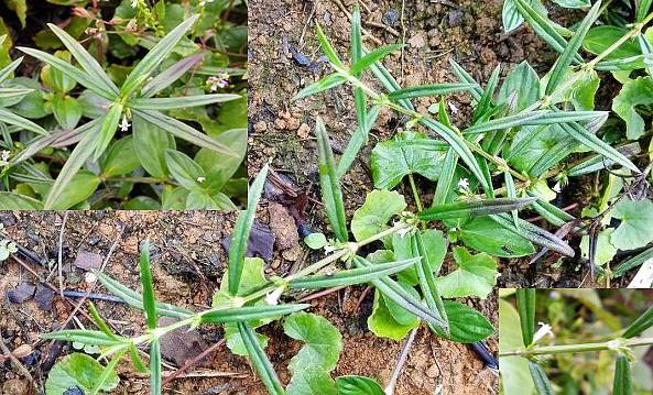 一年生纤弱披散草本,高约15~40厘米。茎秃净,干时带光泽。单叶对生,具极短柄;叶片线形或线状披针形,长2.5~5厘米,宽3~5毫米,先端短尖,全缘,背卷,基部钝,稍革质,上面深绿,下面浅绿,干时为黑紫色;托叶合生,膜质,长3~8毫米,背有短扁尖毛,边缘具较长的刚毛。花1~3朵聚生叶腋,无花柄;花萼长约3毫米,4裂,裂片具睫毛;花冠白色,长约3毫米,4裂,裂片披针形;雄蕊4枚,着生于花冠管上;子房2室,花柱线状,柱头略膨大。蒴果卵圆形,长2.5毫米,宽1.5~2毫米,顶部裂开;种子多数。花期夏季。果期秋季。
