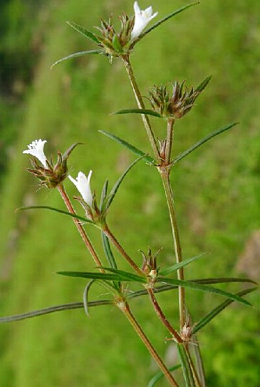 一年生纤弱草本,长15~30厘米。茎四角形,有分枝,下部被微毛。叶对生,无柄;叶片狭线形,长1~4厘米,宽1~2毫米,上面深绿色或带紫色,被毛,下面绿色;托叶2枚,长约4毫米,顶端具刺毛。花3~10朵聚生于叶腋及枝梢,间或单生,无柄;萼齿4,椭圆状三角形,边缘有睫毛;花冠白色或稍染紫红色,长约4毫米,裂片4,矩圆形;雄蕊4;雌蕊柱头2裂,上部被粉块状小毛。蒴果卵形,长约3毫米,被粗毛。花期秋冬。果期秋冬至翌春。夏、秋采收,鲜用或晒干。