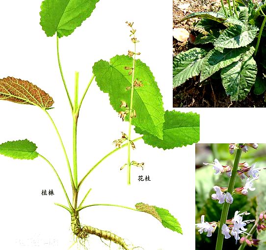 多年生草本,高25~45厘米。茎的基部斜倾或直立,茎方形,多棱,腋间分枝,紫红色,有短细毛。叶对生,有时具1或2全裂小叶片;叶片倒卵形至长卵形,长3~10厘米,阔2~6厘米,先端圆形至渐尖,钝头,边缘有锯齿,上面绿色,下面乌红色,基部心脏形;叶柄长1~7厘米,近花序处近于无柄。轮伞花序,顶生及腋生,海轮约5朵小花,花径4毫米;萼钟形,有细毛,萼齿三角形,先端具小尖;花冠2唇形,上半部紫红色,下部黄白色;发育雄蕊2,柱头2裂,均伸出于花冠外面。小坚果卵形。花期5月。果期5~6月。5~6月采集开花的全草,晒干。