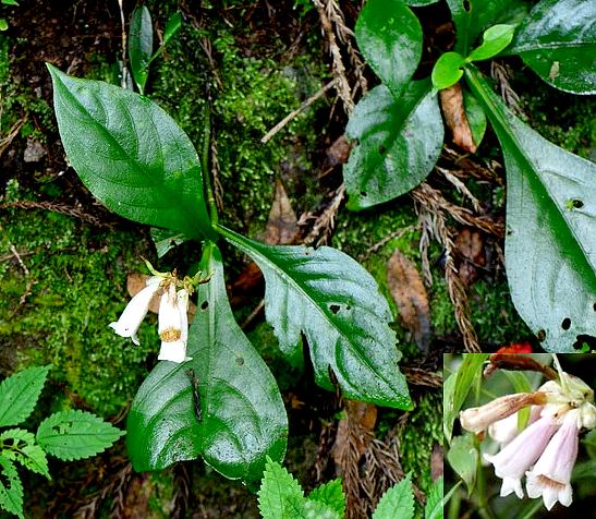 多年生草本,高20~30厘米。基部伏地,有须根。茎四棱形,近光滑或微有细毛,有棕黑色斑点。叶对生,长椭圆形,长10~20厘米,宽6~10厘米,先端尖,基部渐狭,下延至柄的基部呈狭翼状,全缘,上面散生白色短毛;叶柄长2~3.5厘米。花3~5朵集成近头状;花梗顶生或上端腋生,长2~3厘米,呈2歧分枝;苞片圆形;花萼6裂,裂片披针形,长约1匣米;花冠广筒形,长3~4厘米,稍近2唇状,淡紫红色;雄蕊2;子房上位。蒴果线形,长2~4厘米。花期8~9月。