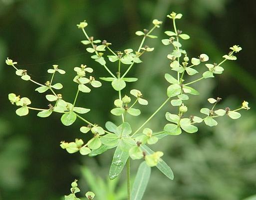 多年生草本,高25~45厘米。根细长。茎直立,下部带紫色,上部分枝,嫩枝绿色,全株含乳汁。茎部叶互生;倒披针形或线状披针形,长2.5~4.5厘米,宽3~4毫米,先端钝圆、微凹或凸头,全缘,中部以上狭细;小伞梗先端的叶密生;线形。杯状聚伞花序顶生或腋生,排列成复伞形,伞梗4~8枝,每枝再分2~4枝小伞梗,上生1对或数对对生的苞叶;萼状总苞,先端具4腺体,呈弯月形,或两端有短角;花单性,无花被,黄色;雄花多数和雌花1枚同生于总苞内;雄花仅雄蕊1,药球形;雌花生于花序中央,有长柄,子房3室,花柱3。蒴果三棱状球形,表面光滑。种子卵形,灰褐色或有棕色斑点,长约2毫米。花期4~7月。