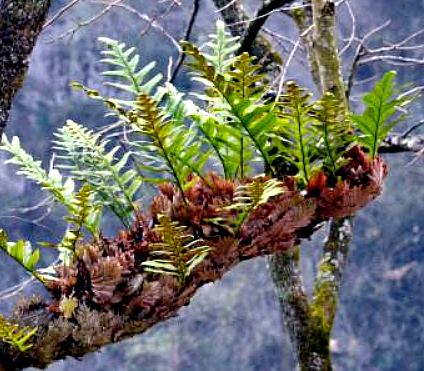 附生草本,高20~40厘米。根状茎肉质粗壮,长而横走,密被棕黄色、线状凿形鳞片。叶二型,营养叶厚革质,红棕色或灰褐色,卵形,无柄,长5~6.5厘米,宽4~5.5厘米,边缘羽状浅裂,很象槲树叶;孢子叶绿色,具短柄,柄有翅,叶片矩圆形或长椭圆形,长20~37厘米,宽8~18.5厘米,羽状深裂,羽片6~15对,广披针形或长圆形,长4~10厘米,宽1.5~2.5厘米,先端急尖或钝,边缘常有不规则的浅波状齿,基部2~3对羽片缩成耳状,两面均无毛,叶脉显著,细脉连成4~5行长方形网眼。孢子囊群圆形,黄褐色,在中脉两侧各排列成2~4行,每个长方形的叶脉网眼中着生1枚,无囊群盖。
