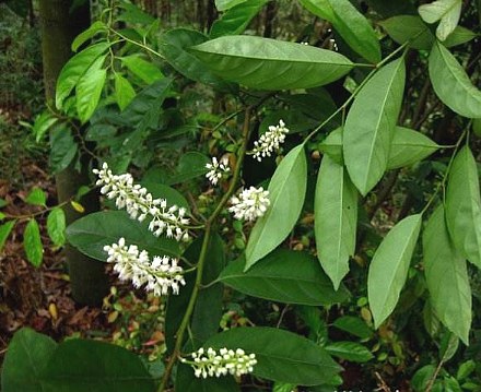 常绿灌木,高2~4米或以上。叶互生,薄革质,倒卵形或矩圆状倒卵形,长6~10厘米,宽2~4.5厘米,先端短渐尖,基部楔形或宽楔形,两面均无毛,边缘具疏锯齿;叶柄长1.5~2厘米。总状花序腋生,长8~11厘米;具叶状苞片;花白色,径约4毫米;萼5裂,三角形,宿存;花瓣5,镊合状排列,斜披针形;雄蕊5,长于花瓣;子房上位,2室,柱头微2裂,稀3裂。蒴果长5~8毫米,2瓣裂,几全分离。花期5~6月。果期9~10月。