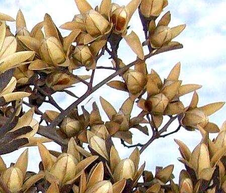 【药材】干燥果实,长2.5~3.5厘米。果皮开裂为5瓣,深裂至全长2/3左右,裂片披针形,先端尖,外表黑褐色,有细纹理,内表黄棕色,光滑,厚约2.5毫米,质脆。果轴呈圆锥形,顶端钝尖,黄棕色,有5条棕褐色棱线。断面内心松泡色黄白。种子着生于果轴及果瓣之间,5列,种子有极薄的种翅,黄白色,半透明,基部斜口状,种仁细小不明显。气微弱。以完整、干燥者为佳。